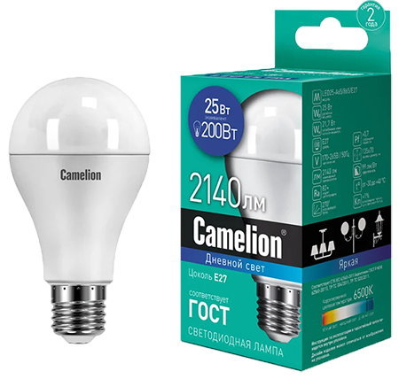 Лампа св/д Camelion ЛОН A65 E27 25W(2140lm 270°) 6500K 6K матов. 134х67