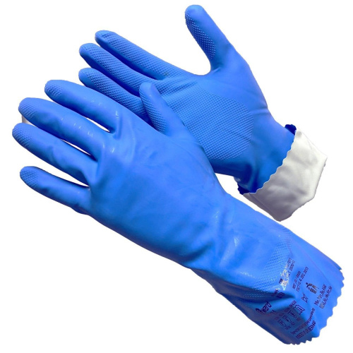 Прочные перчатки из натурального латекса. Специально разработанны для защиты от химии и работы с пищей (обеспечивают отличную защиту от жиров и масел). По своим защитным свойствам и толщине стенок превосходят лабораторные технические перчатки, сохраняя повышенную эластичность и комфорт. Двойное хлорирование: При двойном хлорировании перчаток из основы вымываются практически все протеины латекса, на которые у некоторых людей возникает аллергия. В состав перчаток входит небольшое количество нитрила высокого качества, улучшающего защитные свойства. Внутренняя часть перчаток специальным образом обработана для лёгкого надевания и снятия перчаток. Защита по сертификату: кислоты до 60%, щёлочи до 50 %, нефть и нефтепродукты (Нс, Нм, Нл, Нт) Длина: 300 мм Вес пары: 66 гр. Толщина стенки: ~0.5 мм