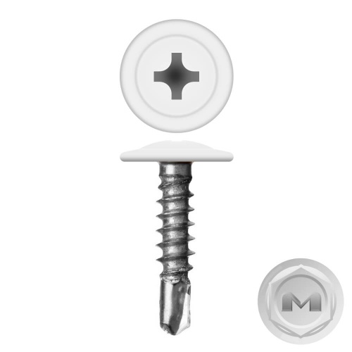 Саморезы с пресс-шайбой премиум-качества имеют глубокий шлиц - phillips № 2, что позволяет закручивать изделие быстро и без срывов. Закаленная высокоуглеродистая сталь саморезов ПШС (сверло) позволяет просверливать лист металла толщиной до 5 мм. Порошковая окраска в цвета RAL/RR осуществляется на автоматическом оборудовании европейского производства. Фирменная маркировка (знак "М") надежно защищает от подделок.