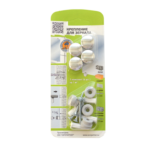 материал втулки, колпачка: АБС - пластик материал дюбеля: нейлон Состав комплекта: втулка - 4 шт.; колпачок - 4 шт.; дюбель для любых оснований MULTI 6х25 мм - 4 шт; шуруп универсальный 3,5х30 мм - 4 шт. Круглые держатели втулки обхватывают зеркало сверху и снизу, плотно прижимая его к стене. Колпачок покрыт однокомпанентной эмалью для пластмасс с последующим защитным слоем лака. Такое покрытие имеет очень высокие показатели стойкости к спиртосодержащим веществам, кремам, моющим средствам и истиранию. Входящий в комплект универсальный дюбель позволяет закрепиться в любые материалы основания. Один комплект крепления рассчитан на установку зеркала толщиной 3-5 мм и общей площадью до 1 м2. МОНТАЖ Просверлите отверстие ⌀ 6(5*) мм. Глубина сверления min. 30 мм. Вставьте дюбель в отверстие. Забейте молотком. Закрутите шуруп сквозь втулку.