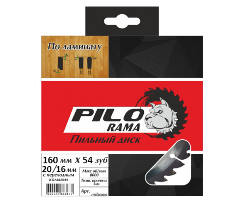 Предназначен для для электрических пил по ламинированным материалам. Устанавливается на монтажные пилы. Расшифровка маркировки: 160мм - диаметр диска, 54 зуб - количество сегментов (зубьев), 20/16мм - посадочный диаметр, "Pilorama" - торговая марка
