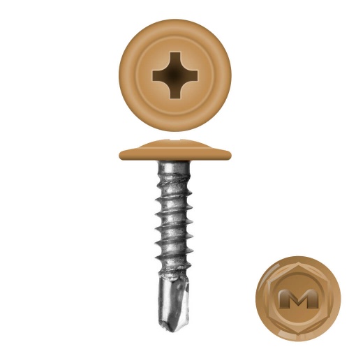 Саморезы с пресс-шайбой премиум-качества имеют глубокий шлиц - phillips № 2, что позволяет закручивать изделие быстро и без срывов. Закаленная высокоуглеродистая сталь саморезов ПШС (сверло) позволяет просверливать лист металла толщиной до 5 мм. Порошковая окраска в цвета RAL/RR осуществляется на автоматическом оборудовании европейского производства. Фирменная маркировка (знак "М") надежно защищает от подделок.